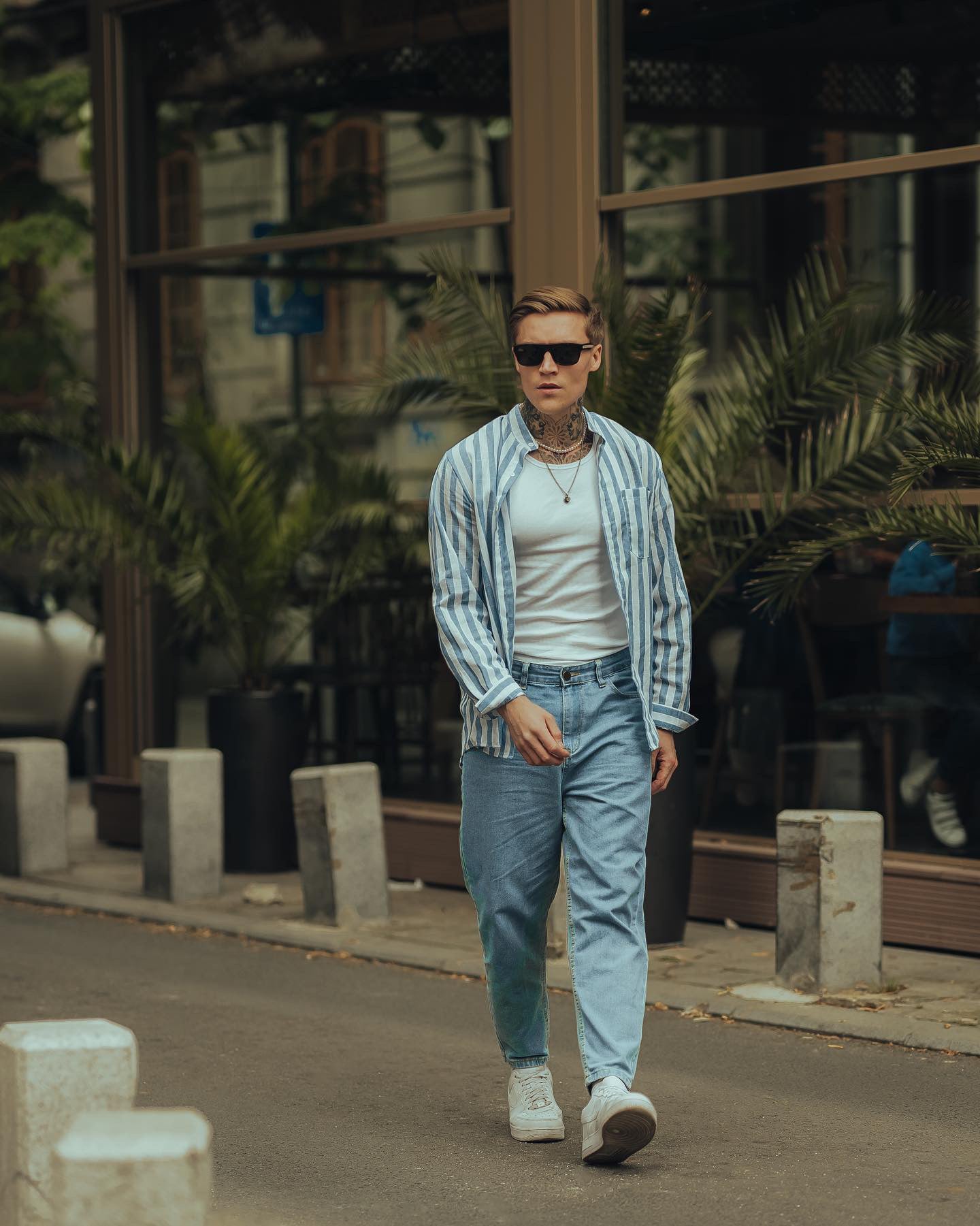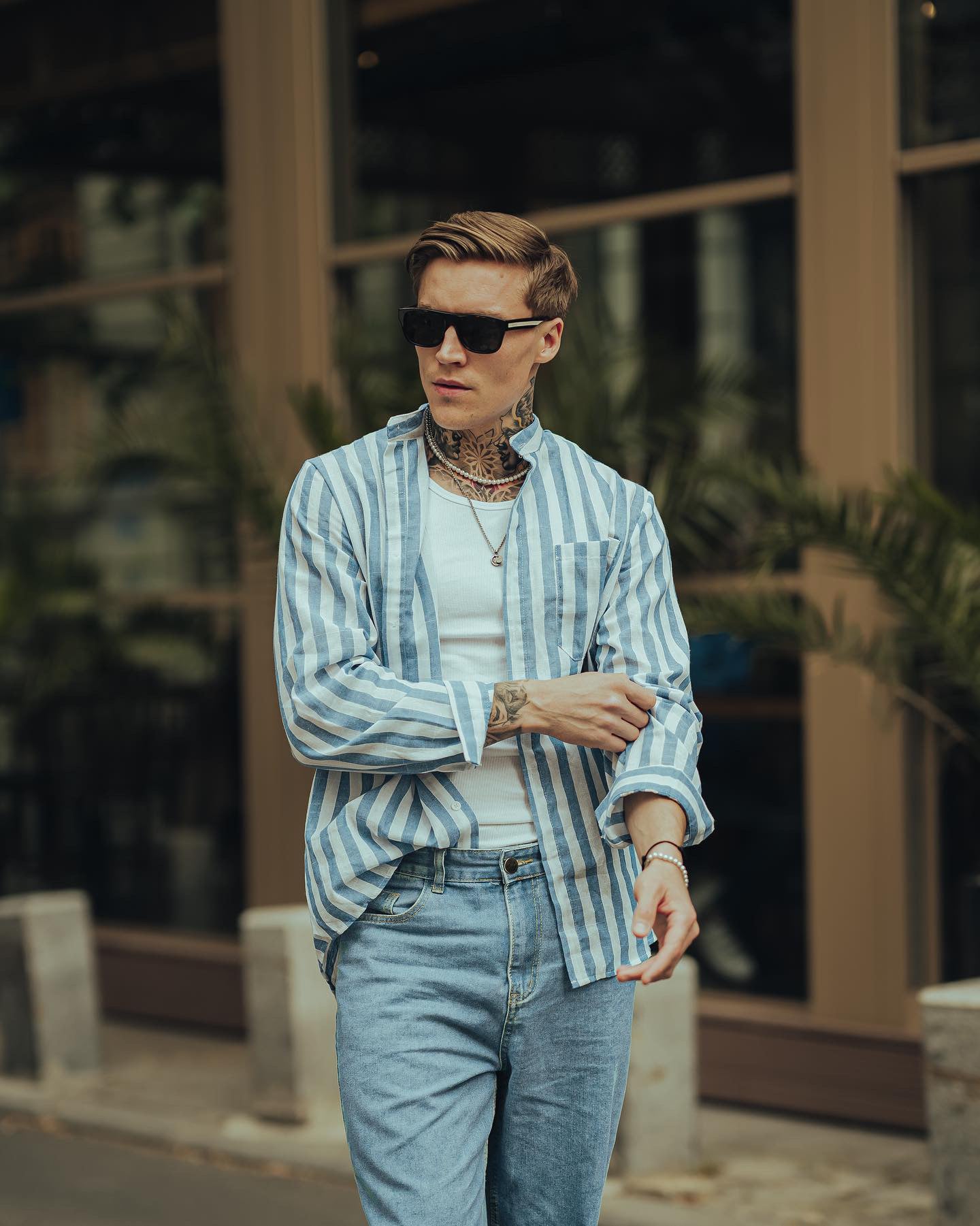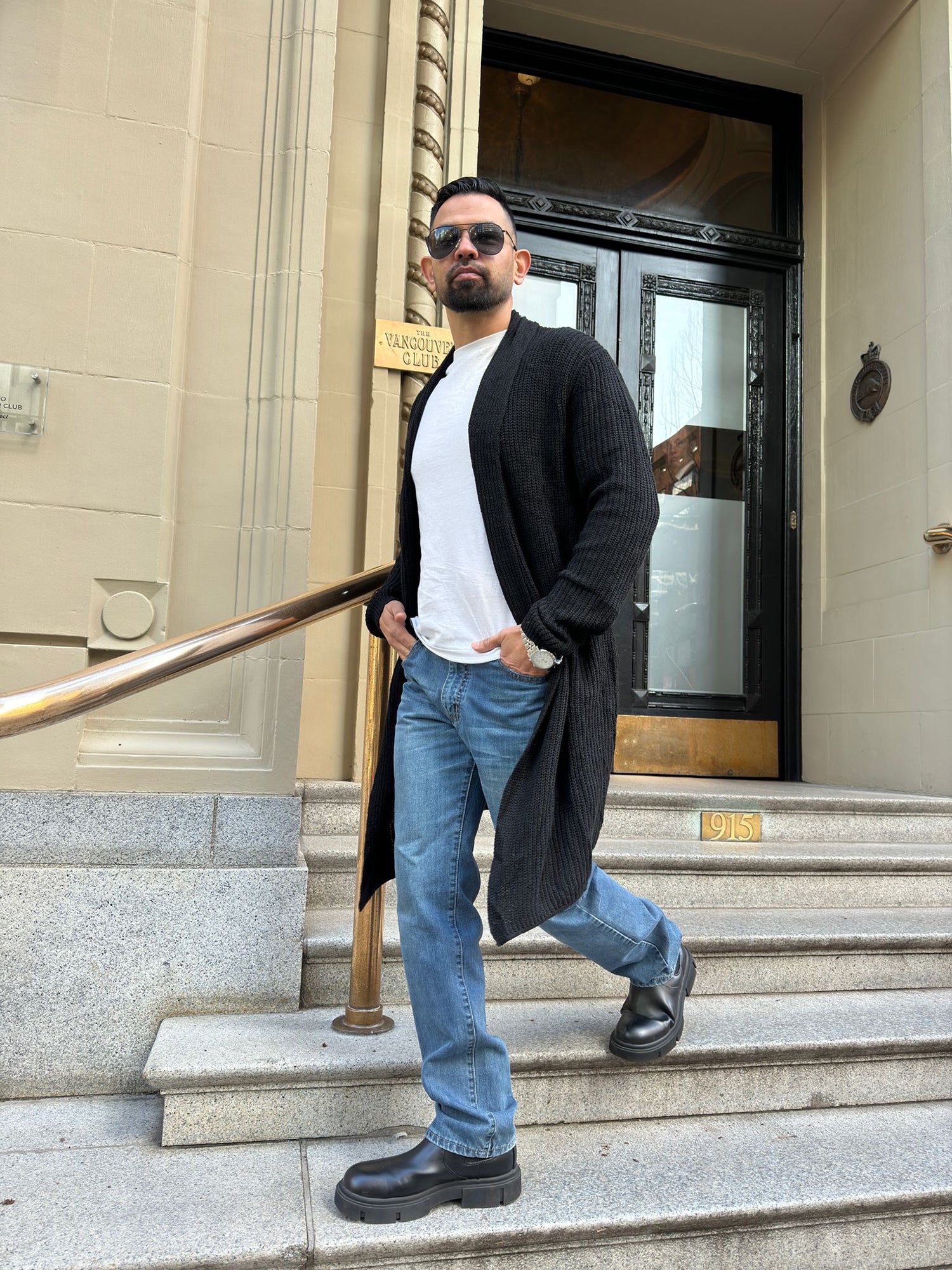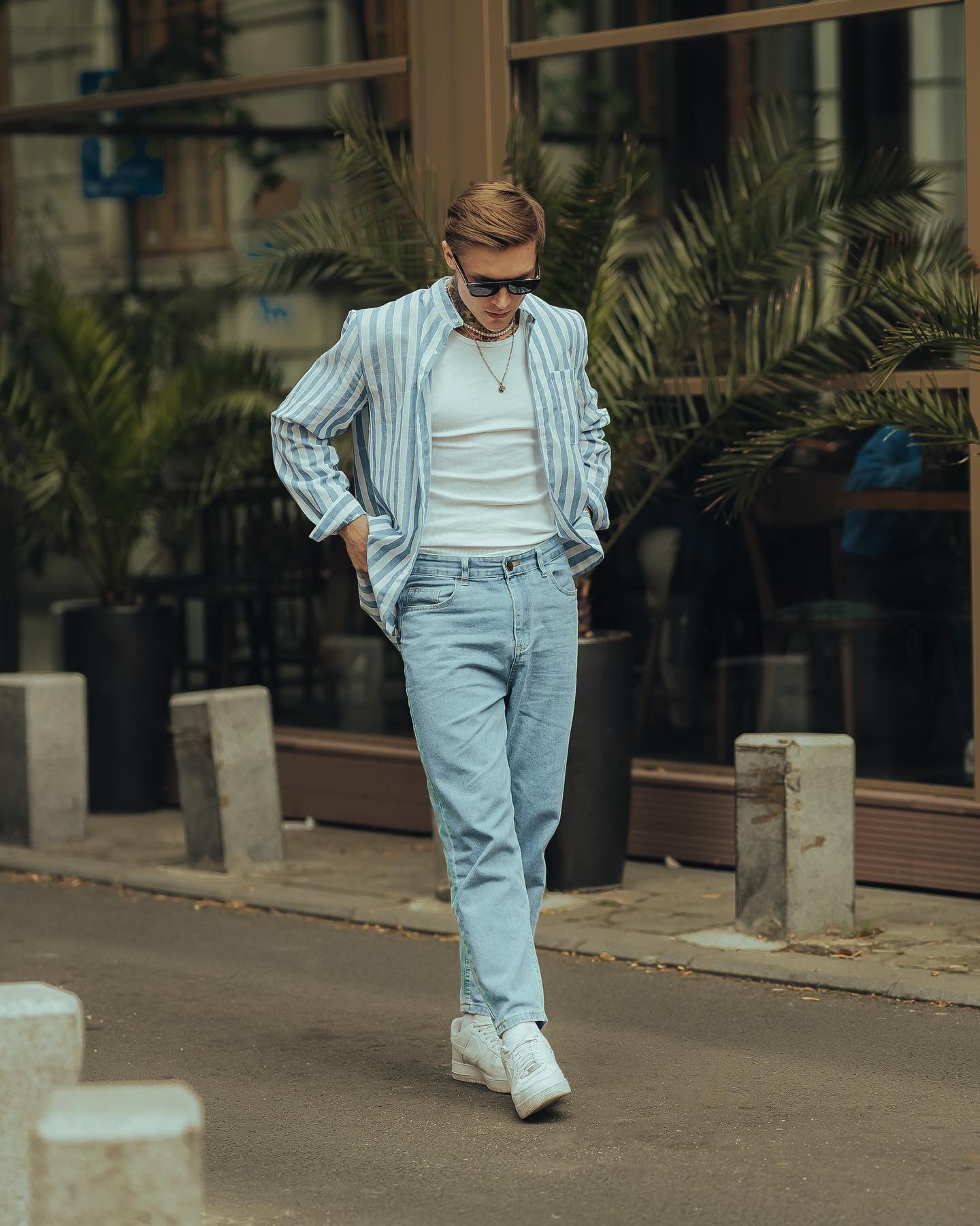 Rocking my favorite blue jeans paired with a stylish striped shirt for that effortless vibe. Both from Coofandy.