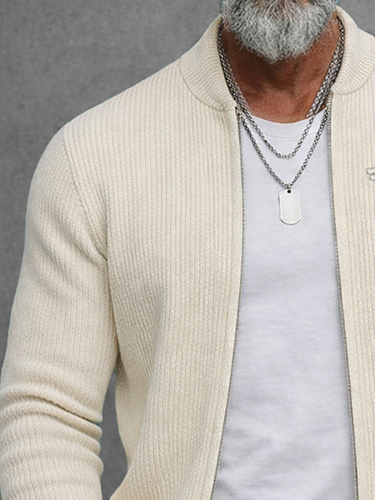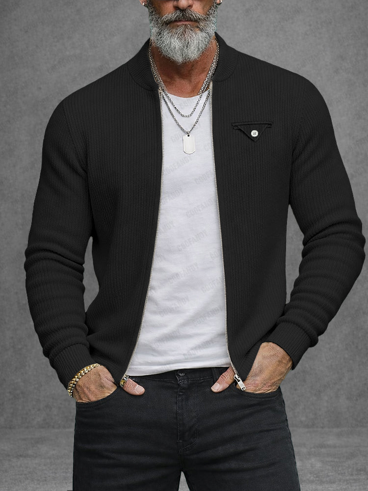 - Design: Elastic knit fabric, zip front, ribbed collar, pocket square decoration