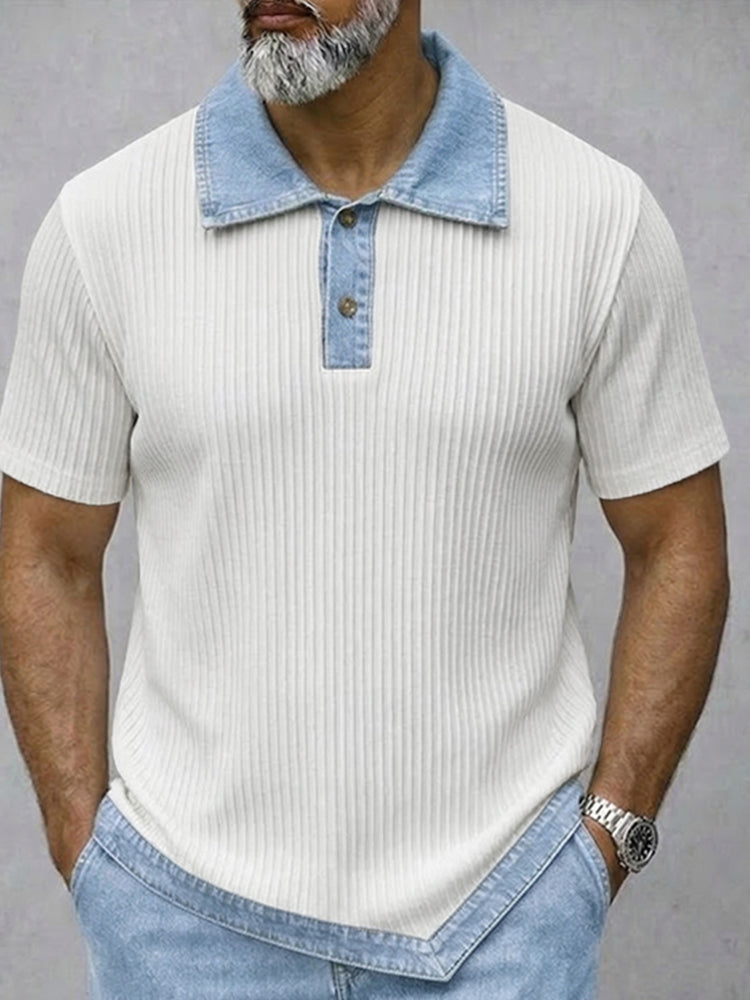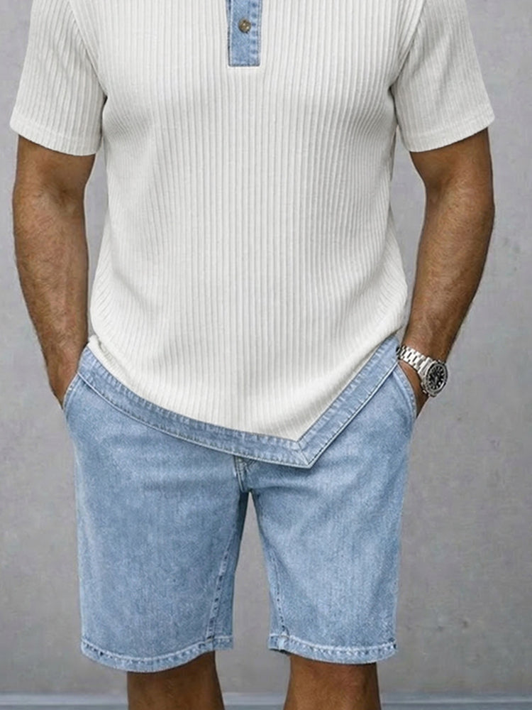 • Top: Short sleeve, contrast denim collar, asymmetric hem