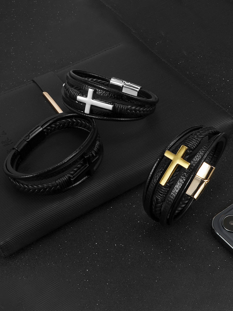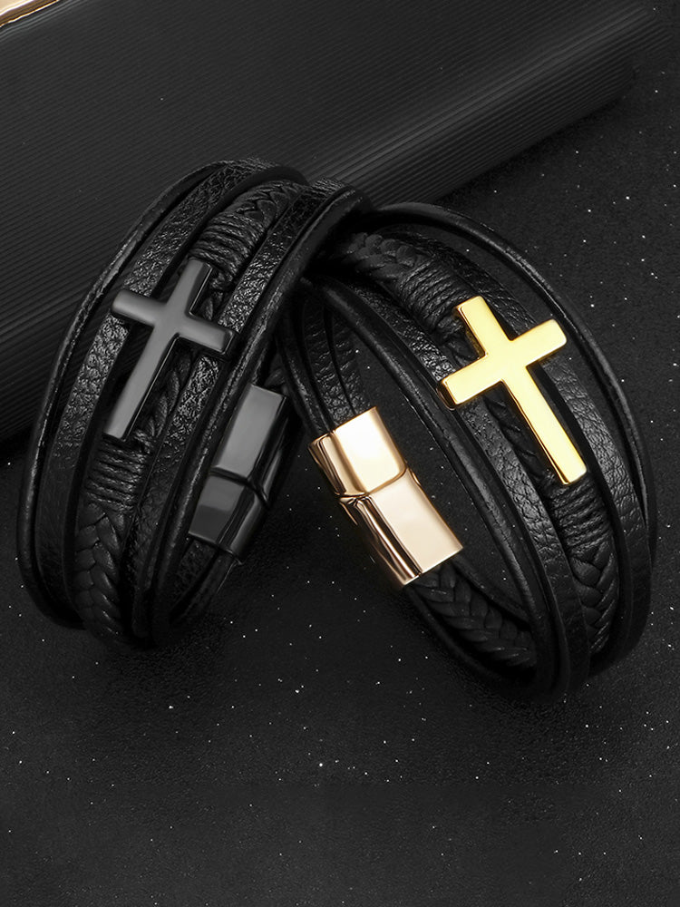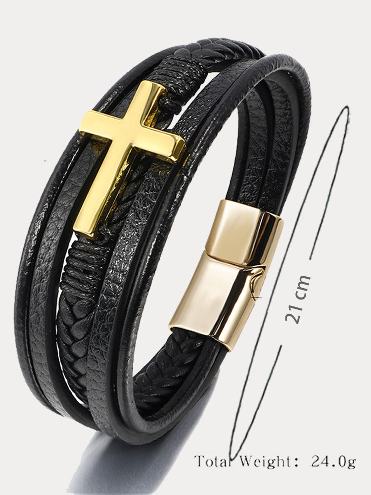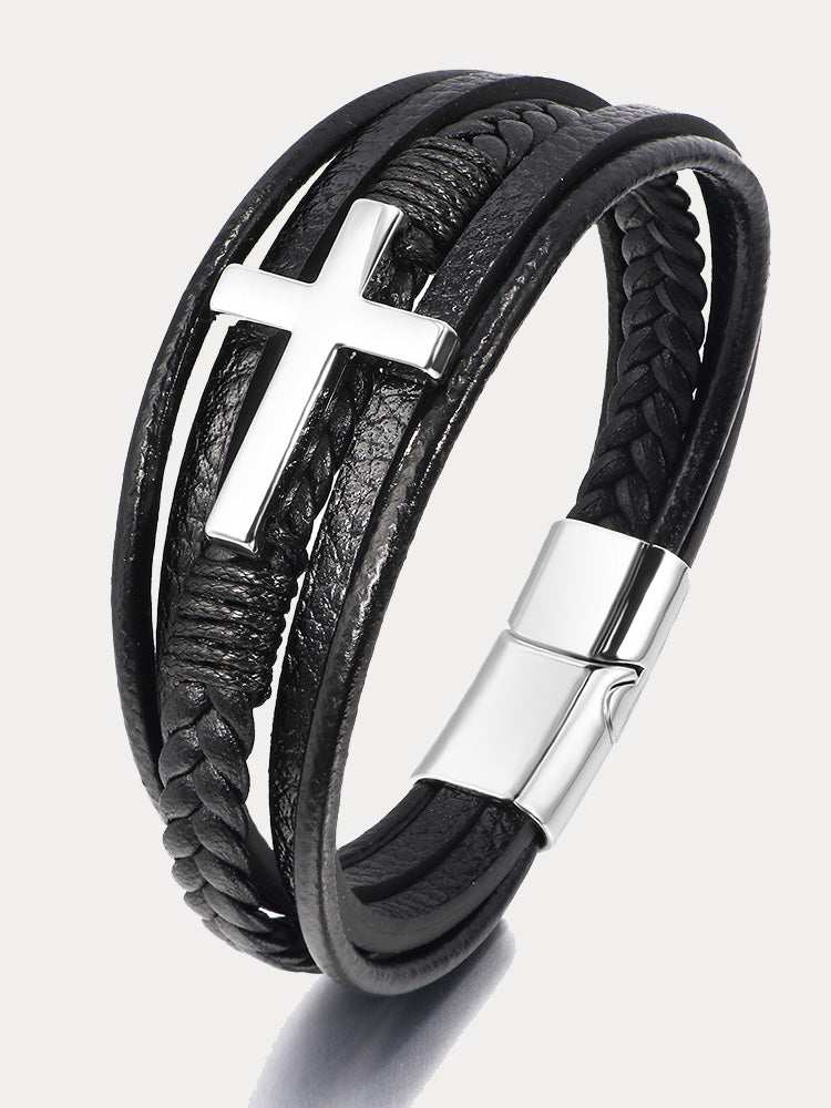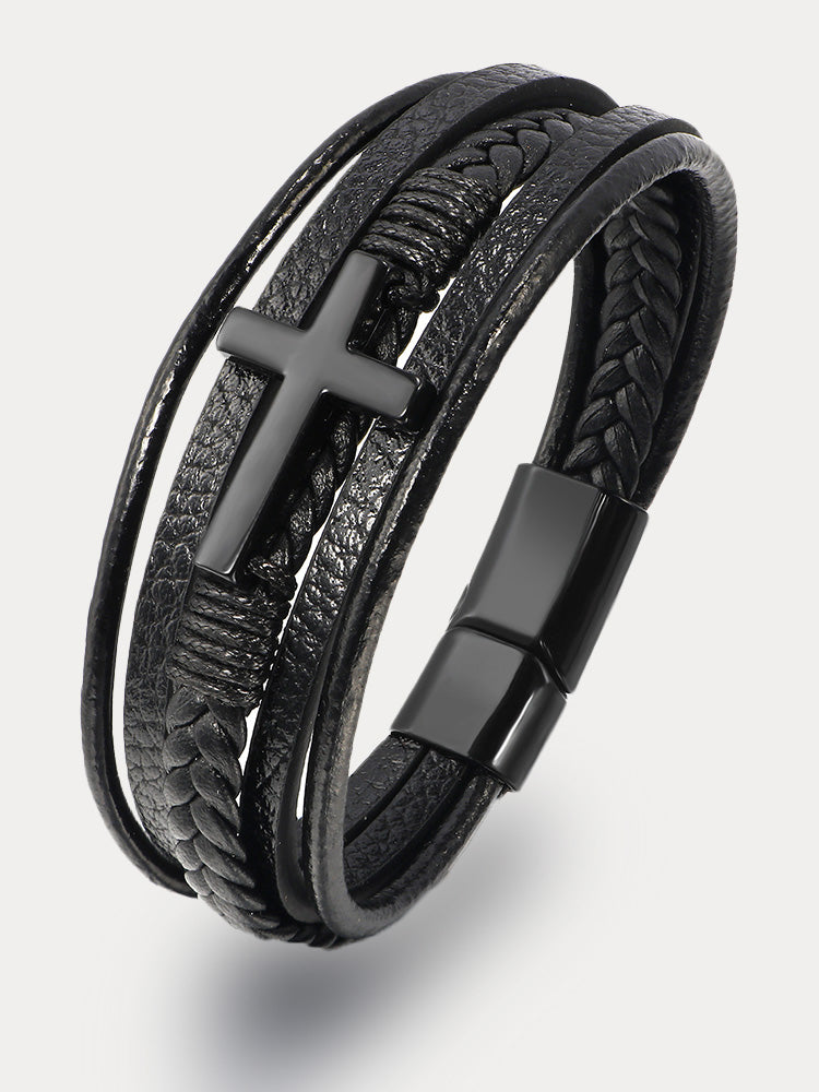Multi-Layer Braided Leather Cross Bracelet