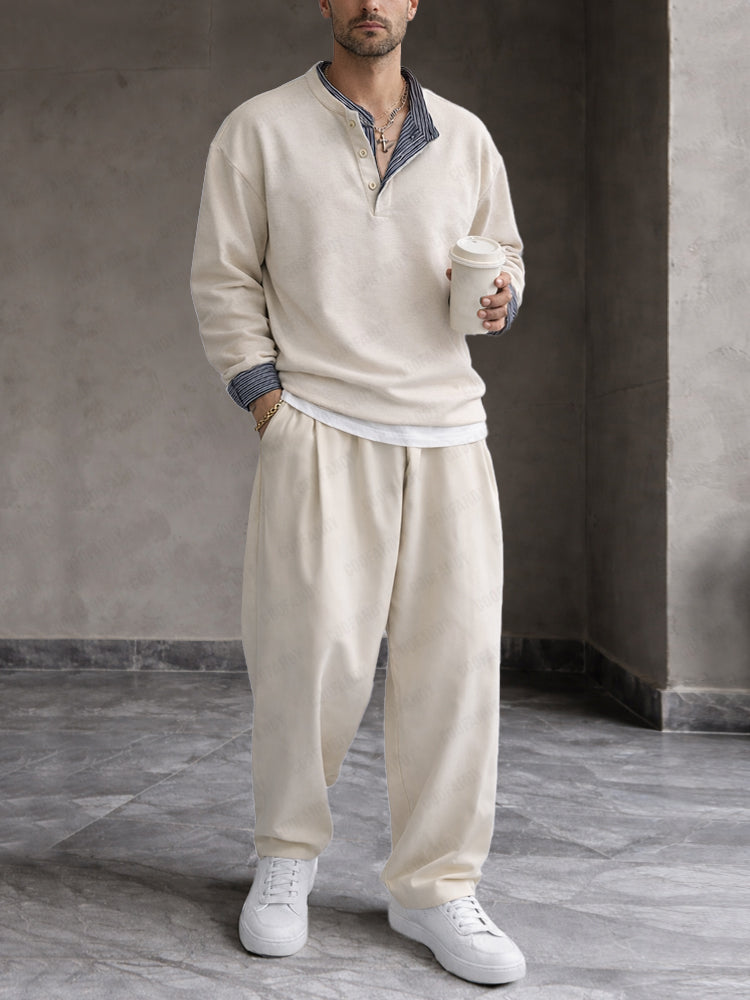 • Top: Stripe patchwork design, Long sleeves, henley collar