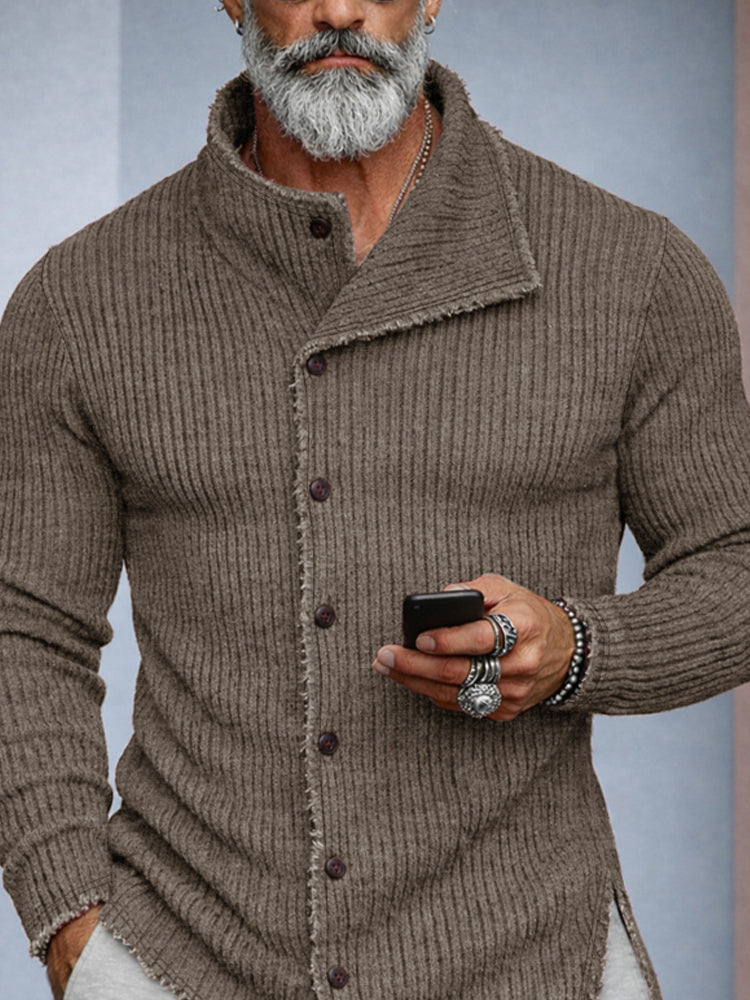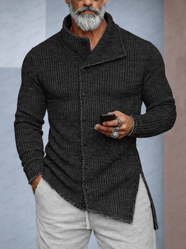 - Design: Elastic knit fabric, turtleneck, raw edge design, slant button closure, asymmetrical split hem