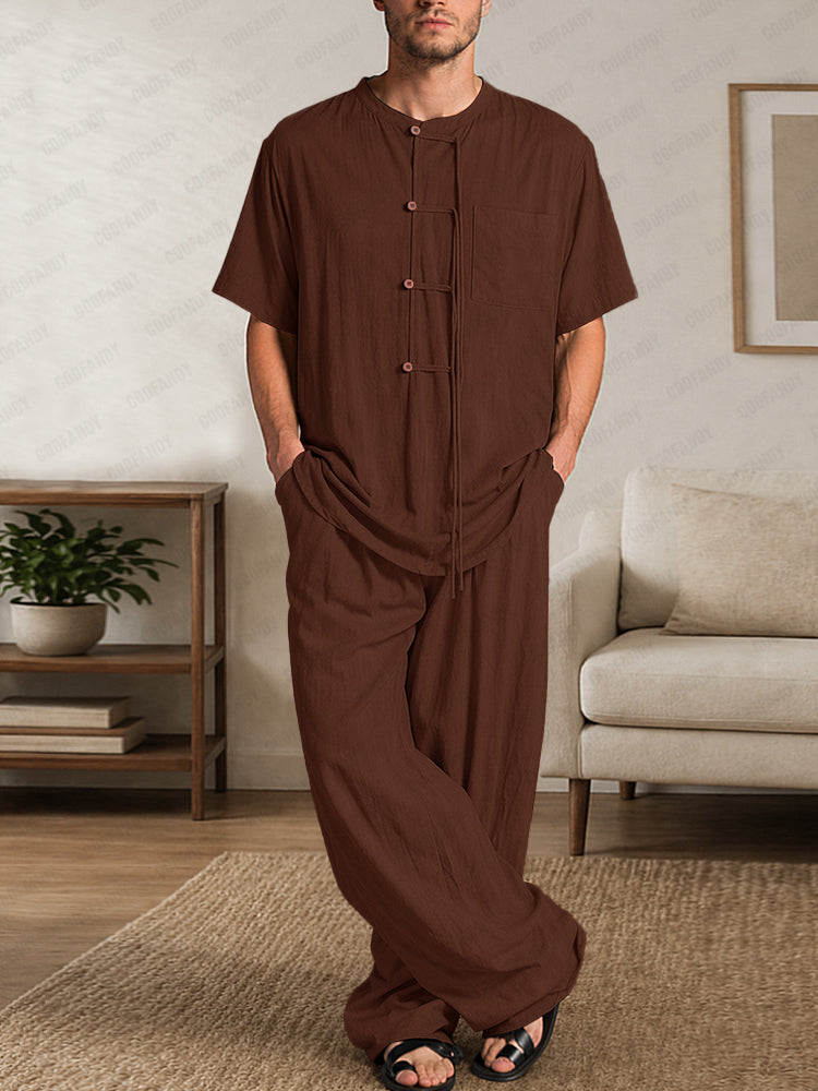 - Top: Short sleeve, collarless, half frog button, chest pocket