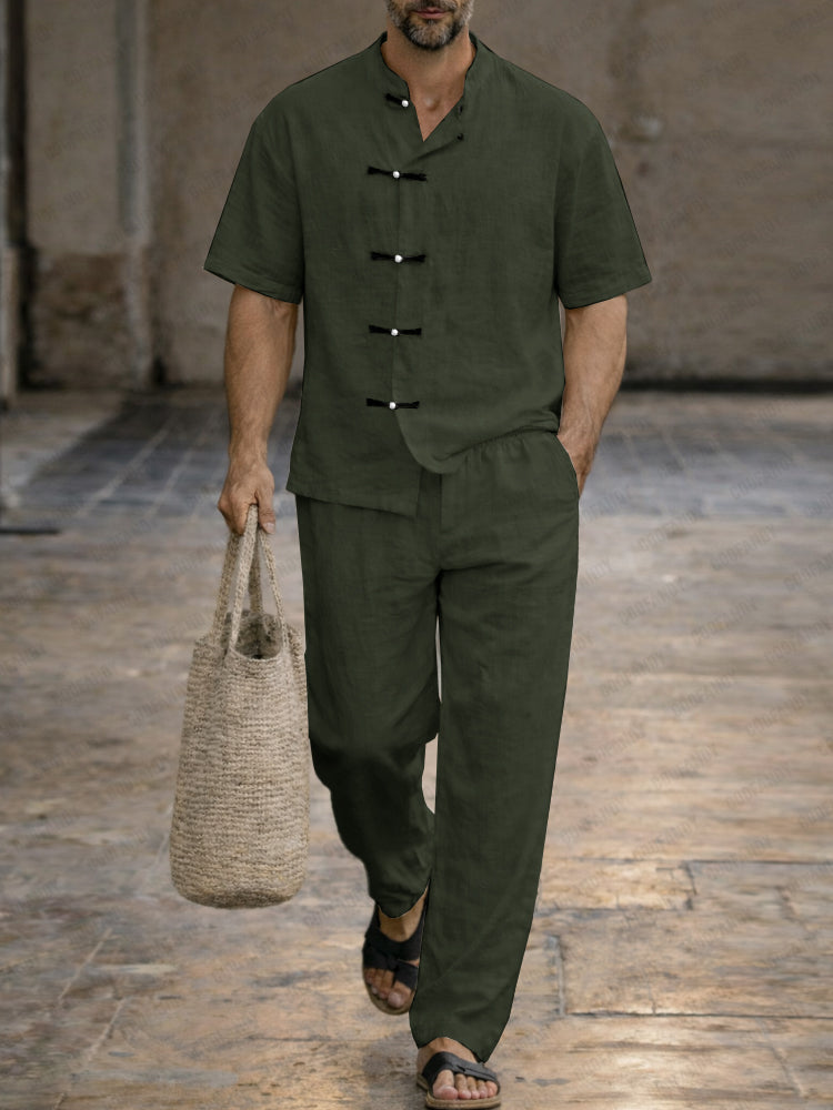 Vintage Frog Button Washed Cotton Shirt Set