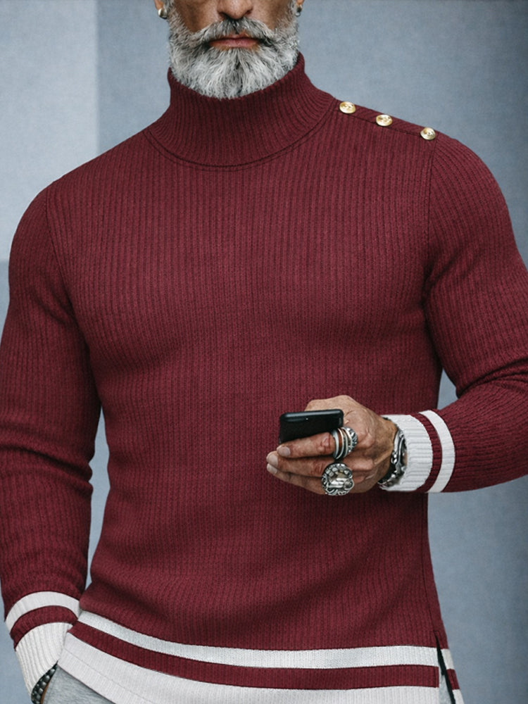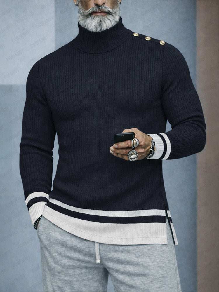 - Design: Elastic knit fabric, turtleneck, button decoration, contrast cuffs & hemline, side slit