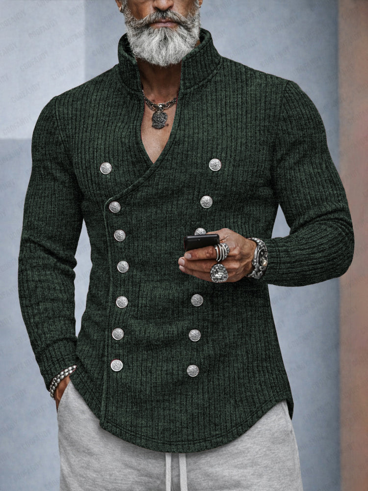 • Design: Elastic knit fabric, double breasted button closure, stand collar, v-neck, curved hemline
