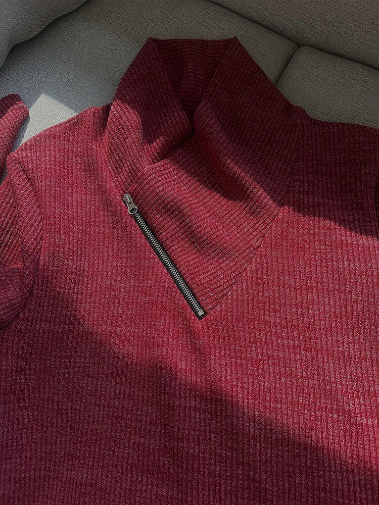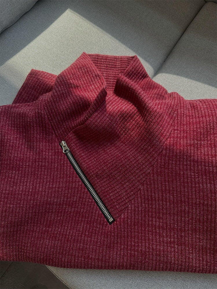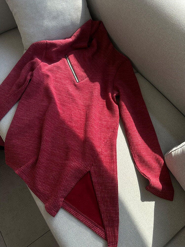 - Design: Elastic knit fabric, unique designer turtleneck, asymmetric hem, zipper accents