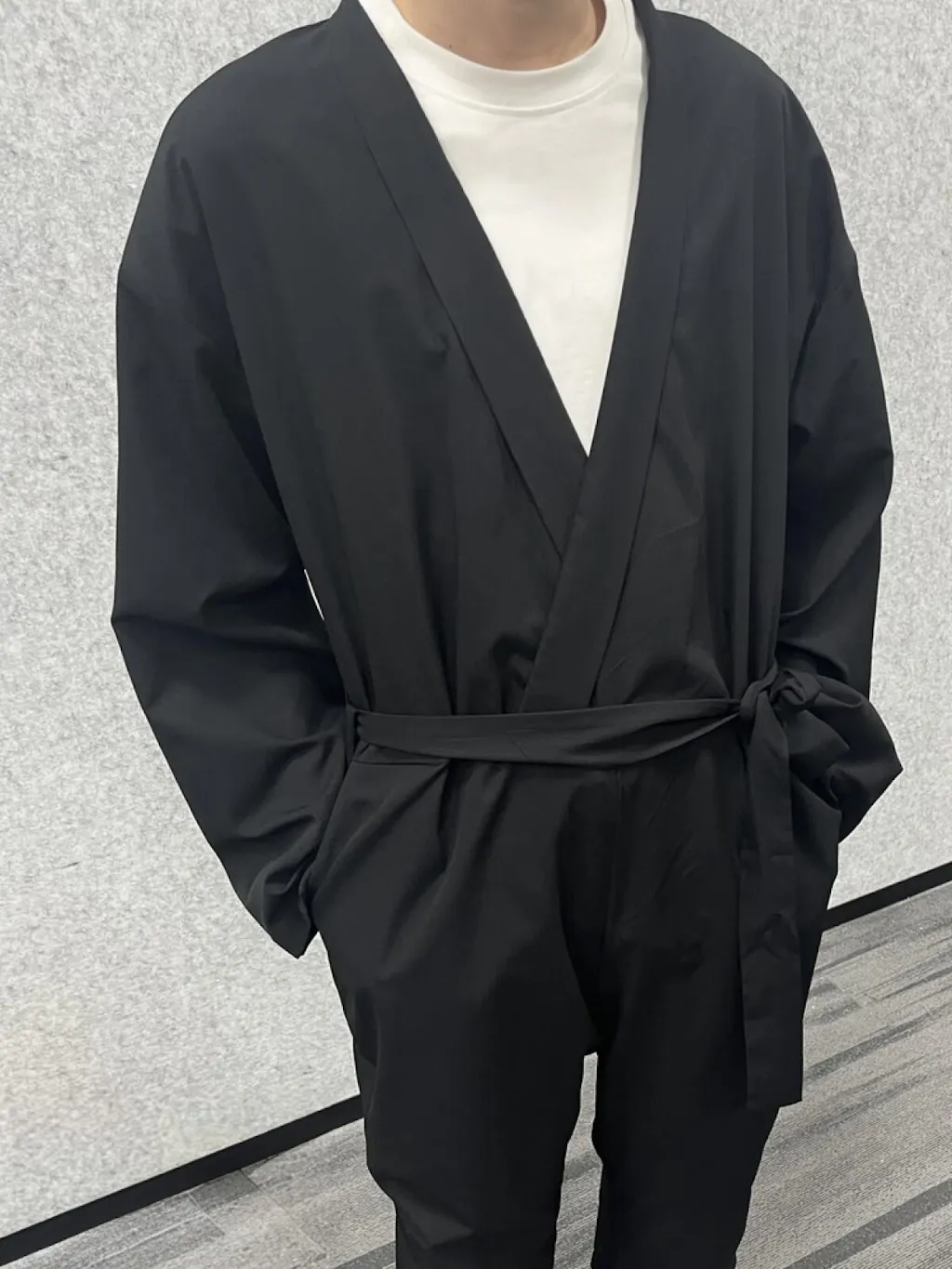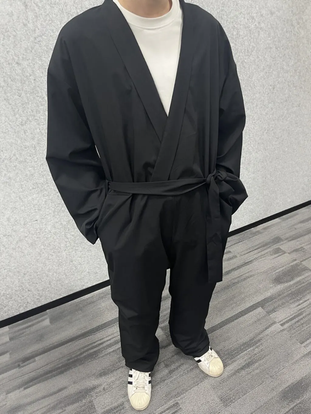 - Details: Belted waist, side pockets, wide leg