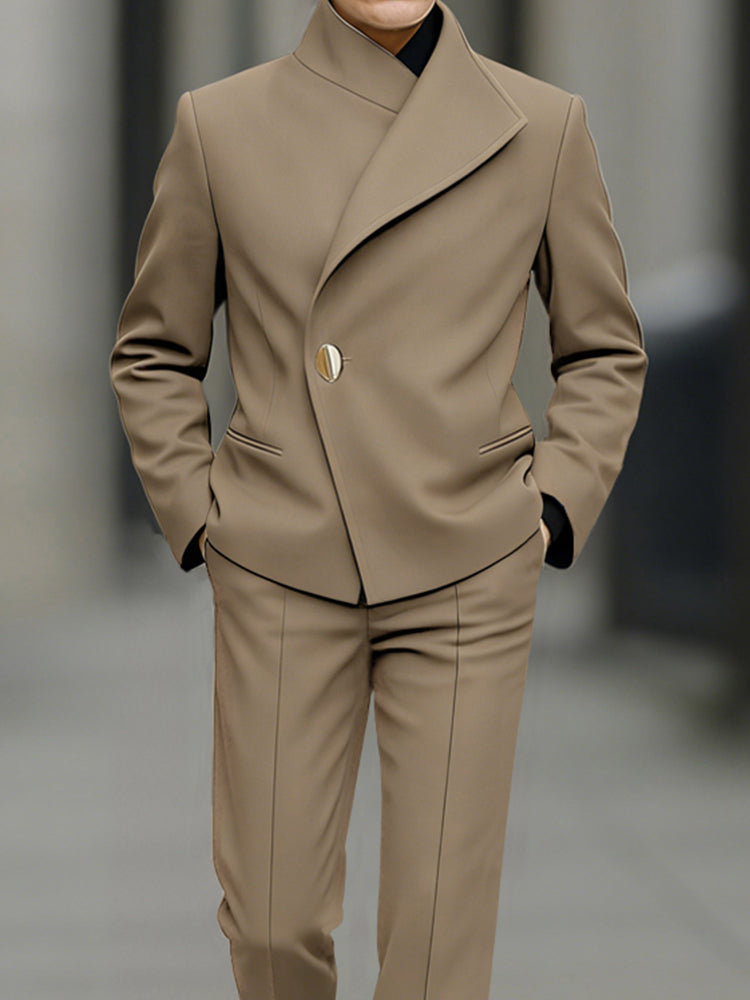 - Top: Asymmetrical lapel, one metal button closure, 2 hand pockets, shoulder pads and lining included