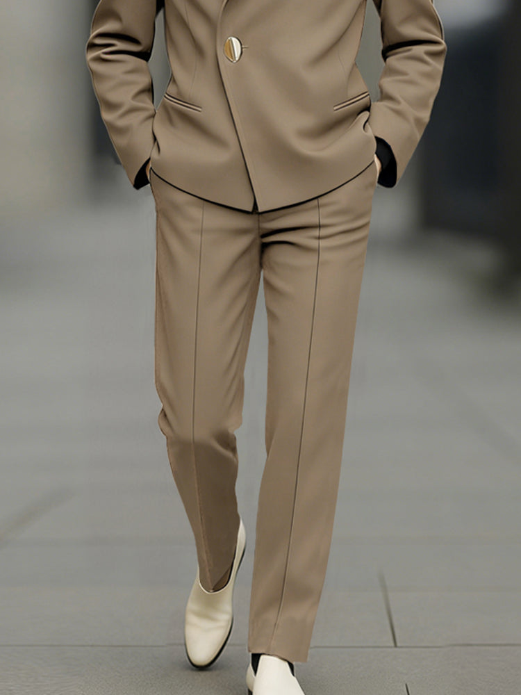 - Bottom: Straight cut, zip closure, back elastic waistband, crease line, 2 slant pockets, one back pocket