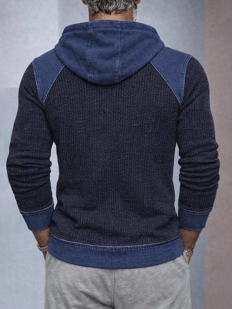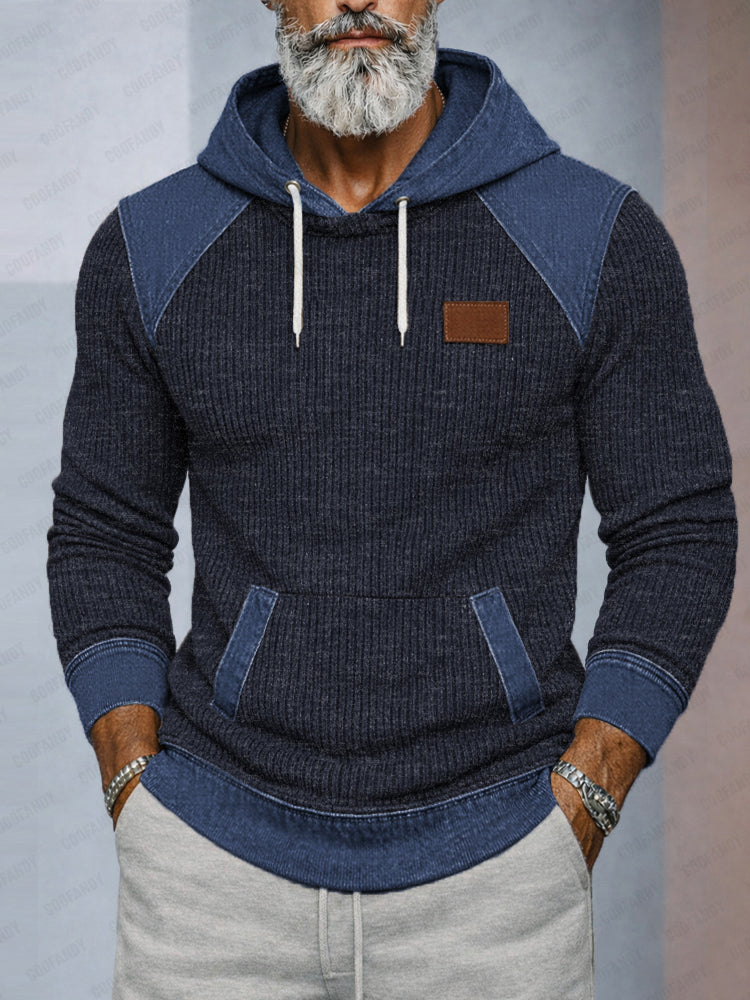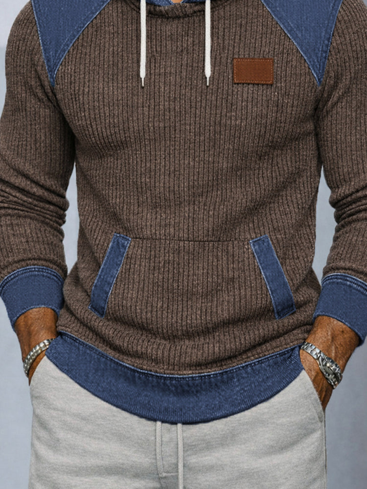 - Design: Denim patchwork design, hood, leather patch, kangaroo pocket
